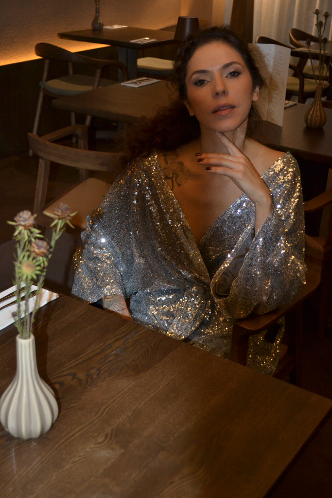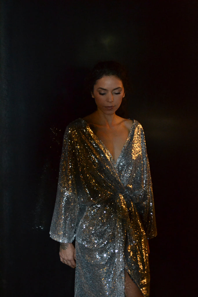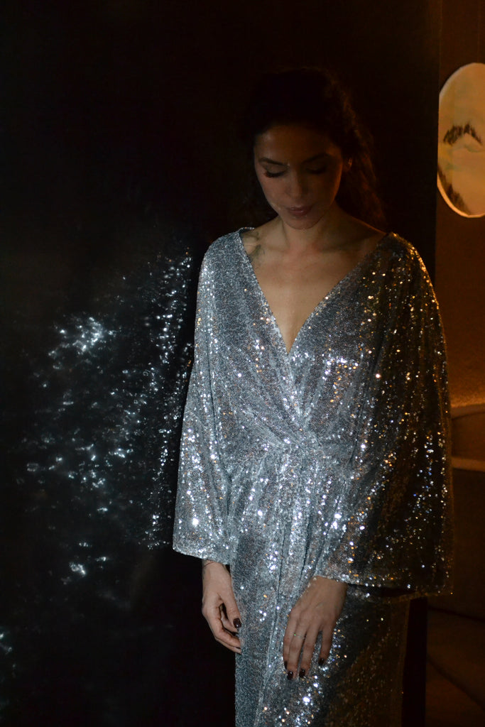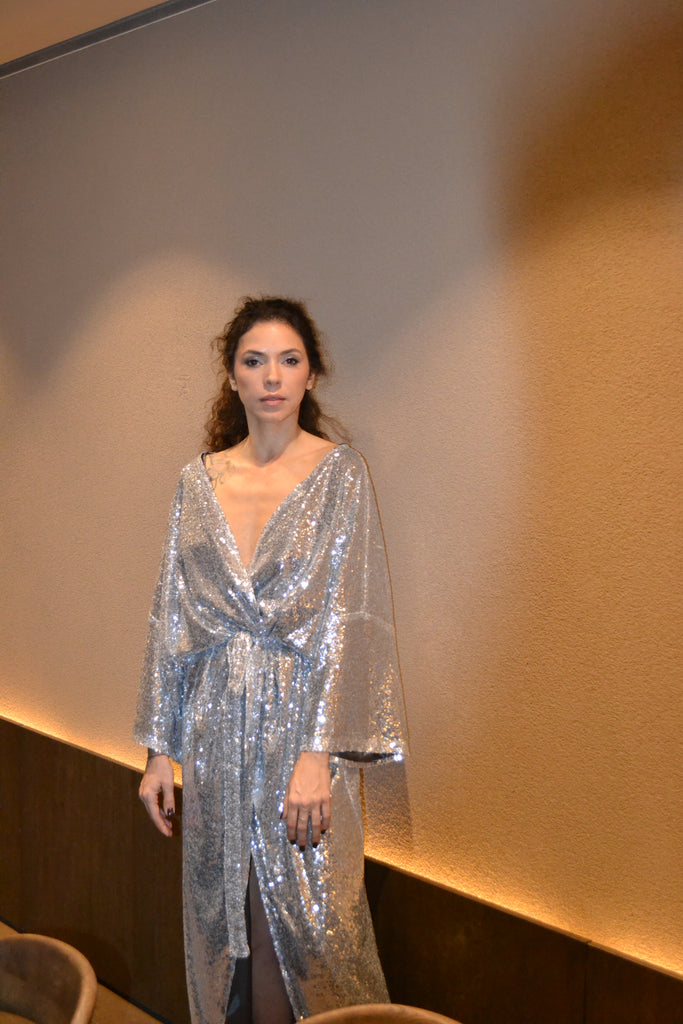 Ši sidabrinė, žvyneliais siūta kimono stiliaus ilga suknelė švelniai krinta ir juda kartu su Jumis, kurdama elegantišką, lengvai dramatišką siluetą. Gilus V formos iškirptė suteikia rafinuotumo, o subtiliai suformuotas liemuo išryškina figūrą nepakenkiant patogumui.